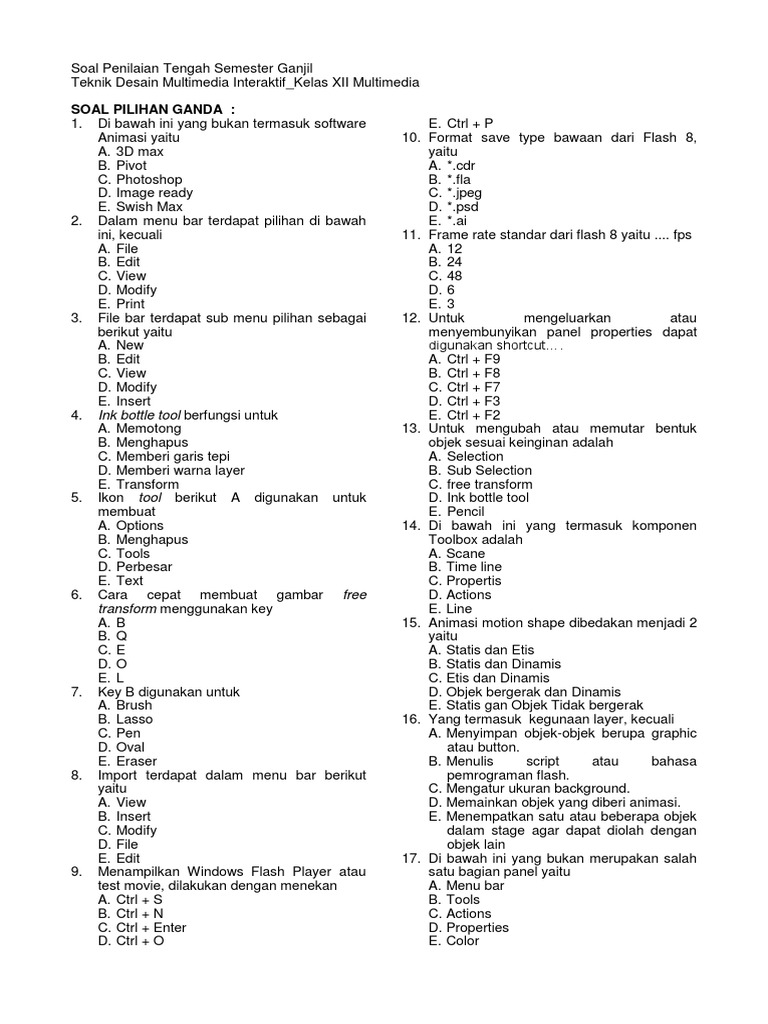 Berilah tanda silang (x) huruf a, b, c, d, atau e pada jawaban yang paling tepat! Jual buku smk desain media interaktif kelas xii kur 2013 revisi. Gambar vektor tersusun dari sekumpulan garis dan kurva. Kota madinah sebelum nabi muhammad saw hijrah bernama. Kali ini acakacakadul akan membagikan silabus untuk kompetensi keahlian multimedia smk kelas xi. Demikian untuk pembahasan kali ini tentang soal uas fiqih kelas 12 semester 1 agar apa yang aku berikan bermanfaat untuk anda para bapak/ibu guru dan para pencari edukasi sebagai materi tumpuan dalam media pembelajaran. Image by mohamed hassan from pixabay. Soal pilihan ganda dan esay serta jawaban animasi 2d & 3d kelas xi multimedia semester i. Download soal desain media interaktif kelas xii. Materi desain grafis kelas xii semester 1. Contoh soal desain grafis kelas 10 beserta jawabannya semester. 72 downloads 1140 views 59kb size. Sebenarnya untuk perangkat pembelajaran smk sendiri sudah ada.