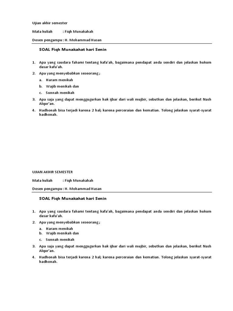 Soal Essay Tentang Munakahat - Soal Pilihan Ganda Tentang Pernikahan Dalam Islam Beserta Jawabannya / We did not find results for:. We did not find results for: Maybe you would like to learn more about one of these? Check spelling or type a new query.